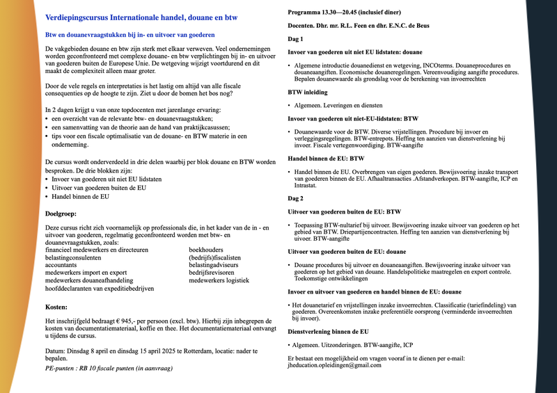 De vakgebieden douane en BTW zijn sterk met elkaar verweven. Veel ondernemingen worden geconfronteerd met complexe douane- en BTW verplichtingen bij in- en uitvoer van goederen buiten de Europese Unie. De wetgeving wijzigt voortdurend en dit maakt de complexiteit alleen maar groter. We gaan tevens in op de gevolgen van de BREXIT voor u en uw cliënten.